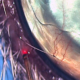 La localización de las masas laríngeas mediante endoscópia es sencilla. Si se trata de másas no pigmentadas, sin cromóforo, será necesario provocar un pre-ennegrecimiento previo de su superficie que actúe como absorvedor de energía y sirva como iniciador para los siguientes pulsos láser. La segunda imagen muestra el aspecto de la cicatriz 15 días después (flecha), en el momento de la revisión endoscópica de la cirugía.